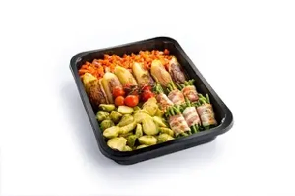 Potje gevuld met laagje heerlijke savooipuree met erop stronkje witloff, rolletje boontjes met spek, zoete worteltjes, spruiten en kerstomaatjes.